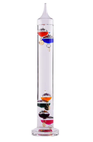 Nommé ainsi en l’honneur du célèbre physicien, ce thermomètre en verre contient un liquide transparent et huit ampoules de verres, remplies d’un liquide coloré, qui se déplacent en fonction de la température ambiante.